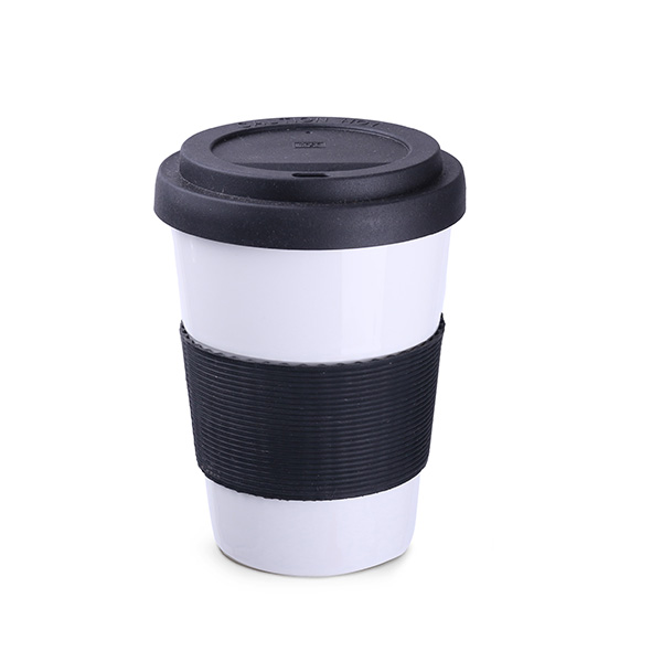 Henkelloser Porzellanbecher mit Kunststoffdeckel und 45mm-Silikonbanderole für alle Freunde von nachhaltigen Produkten. Deckel und Silikonbanderole (45 mm) in 8 Standardfarben erhältlich.